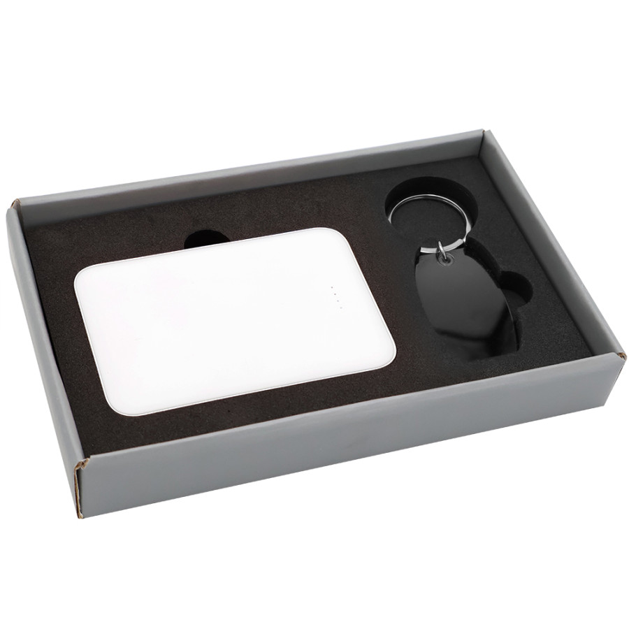 Подарочный набор в элегантной цветной картонной коробке серого цвета с конструкцией крышка-дно. Внутри расположены аккуратно закрепленные на ложементе внешний аккумулятор емкостью 5000 мА·ч и металлический карманный брелок. Внешний аккумулятор обладает компактным дизайном и обеспечивает надежный запас энергии для мобильных устройств в пути, а стильный металлический брелок станет практичным и эстетичным аксессуаром для ключей. Этот набор идеально подходит в качестве презента для тех, кто ценит удобство, качество и современный стиль.