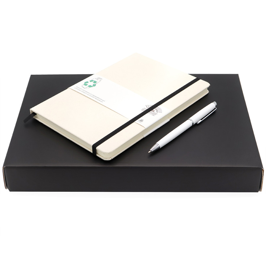 "Writer" — Подарочный набор в элегантной цветной коробке черного цвета с конструкцией крышка-дно. Внутри расположен ложемент, специально разработанный для надежного и аккуратного размещения всех элементов набора. В набор входят стильный ежедневник с плотной обложкой (арт. 51013. 02) и изысканная ручка (арт. 1059. 01), идеально дополняющая комплект. Такой набор станет отличным подарком для деловых людей и ценителей качественных канцелярских принадлежностей, сочетая в себе утонченность, практичность и презентабельность.