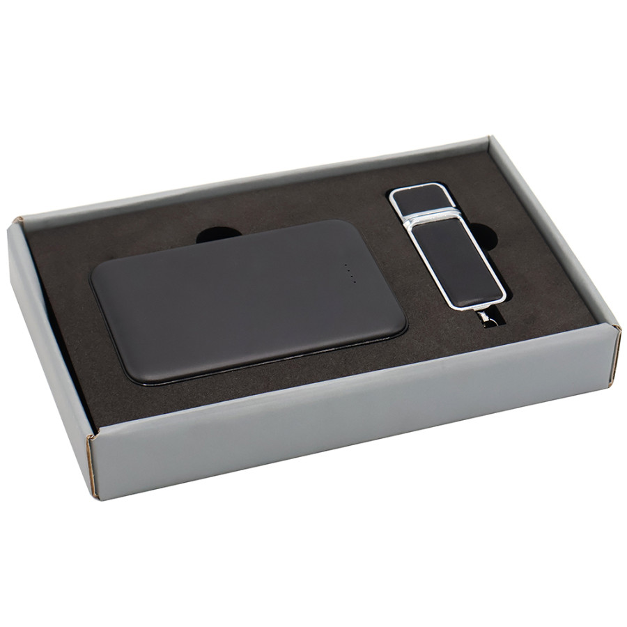 Подарочный набор в стильной цветной картонной коробке серого цвета с конструкцией крышка-дно. Внутри на аккуратном ложементе расположены внешний аккумулятор емкостью 5 000 мА·ч и элегантная флешка объемом 16 ГБ в корпусе с вставками из искусственной кожи. Мощный аккумулятор обеспечивает быстрое и надежное питание мобильных устройств, а флешка в изысканном дизайне сочетает вместительность с темой премиального стиля, надежно сохраняя ваши цифровые файлы. Такой набор станет стильным и практичным подарком для деловых и активных людей, ценящих качество и эстетичность.