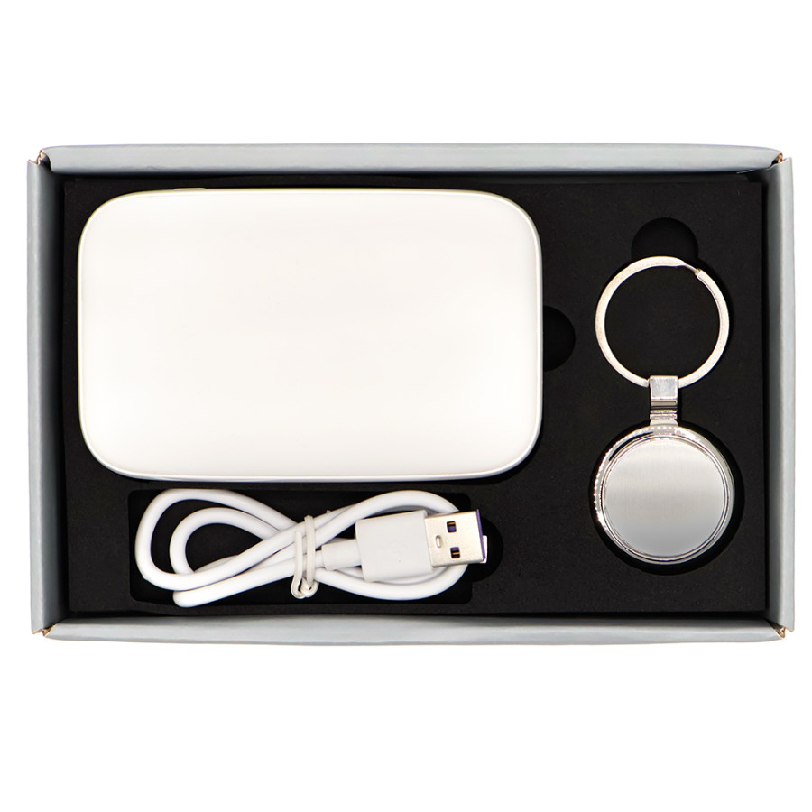 Подарочный набор в элегантной цветной картонной коробке серого цвета с конструкцией крышка-дно. Внутри расположены аккуратно закрепленные на ложементе внешний аккумулятор емкостью 10000 мА·ч с быстрой зарядкой, и металлический карманный брелок. Внешний аккумулятор обладает компактным дизайном и обеспечивает надежный запас энергии для мобильных устройств в пути, а стильный металлический брелок станет практичным и эстетичным аксессуаром для ключей. Этот набор идеально подходит в качестве презента для тех, кто ценит удобство, качество и современный стиль.