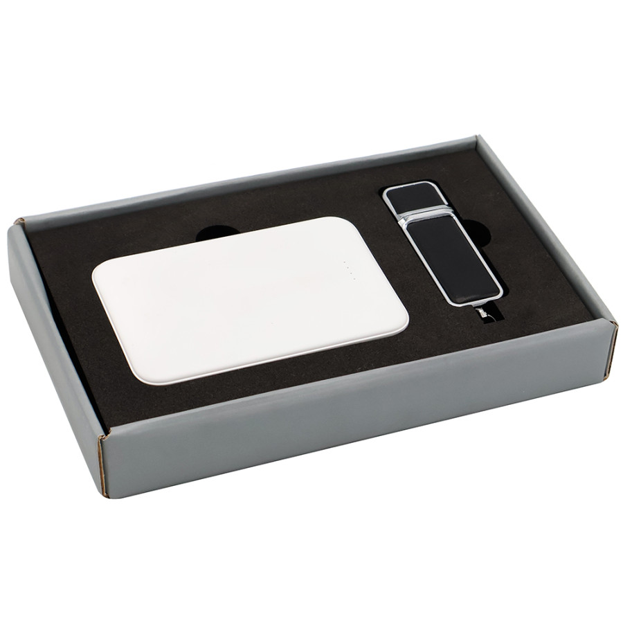 Подарочный набор в стильной цветной картонной коробке серого цвета с конструкцией крышка-дно. Внутри на аккуратном ложементе расположены внешний аккумулятор емкостью 5 000 мА·ч и элегантная флешка объемом 16 ГБ в корпусе с вставками из искусственной кожи. Мощный аккумулятор обеспечивает быстрое и надежное питание мобильных устройств, а флешка в изысканном дизайне сочетает вместительность с темой премиального стиля, надежно сохраняя ваши цифровые файлы. Такой набор станет стильным и практичным подарком для деловых и активных людей, ценящих качество и эстетичность.