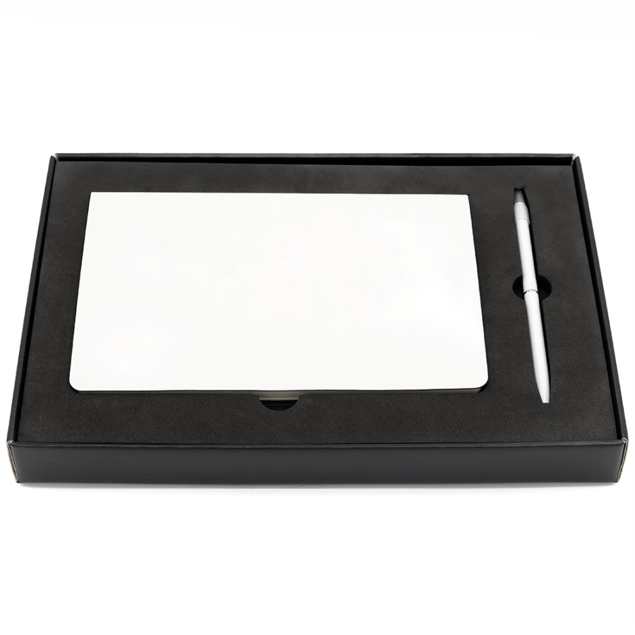 Подарочный набор в стильной цветной картонной коробке черного цвета (крышкой-дно). Внутри на аккуратном ложементе располагаются ежедневник А5 и вечный карандаш с шариковой ручкой.