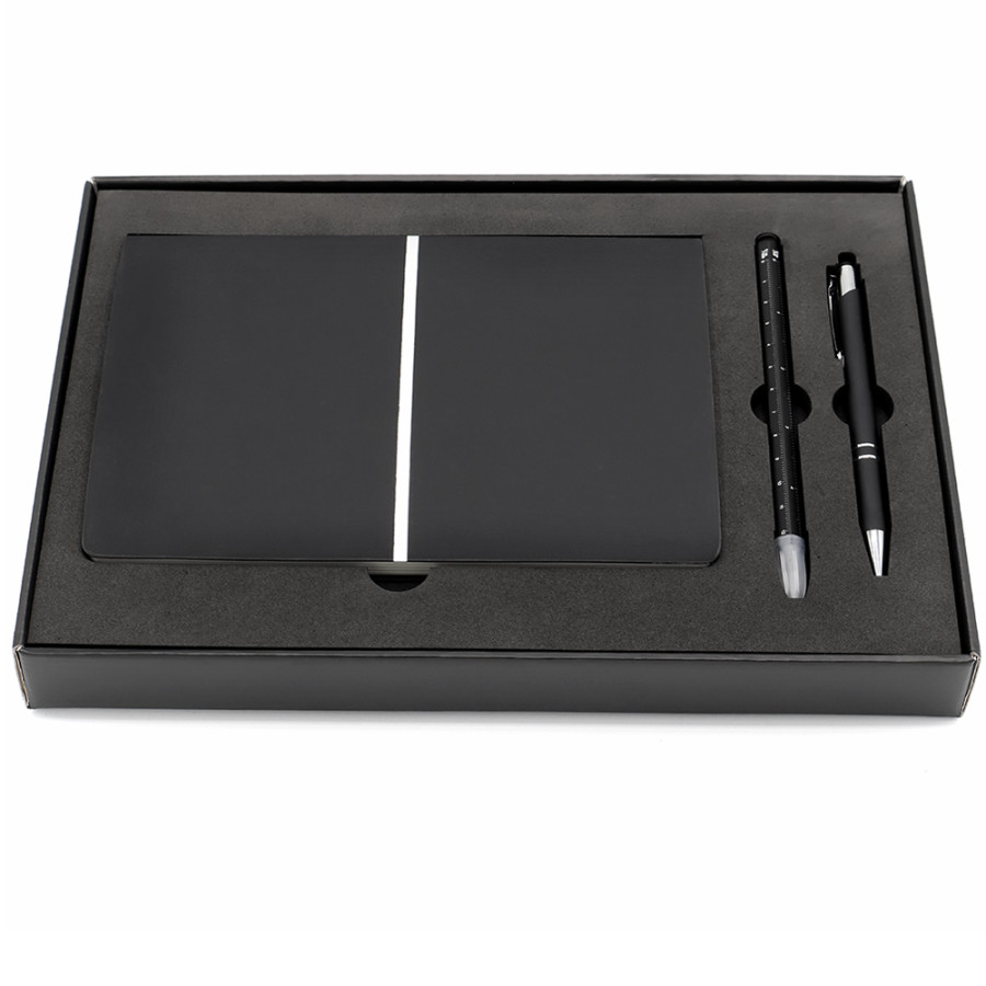 Подарочный набор в стильной цветной картонной коробке черного цвета (крышкой-дно). Внутри на аккуратном ложементе располагаются ежедневник, ручка металлическая, и вечный карандаш.