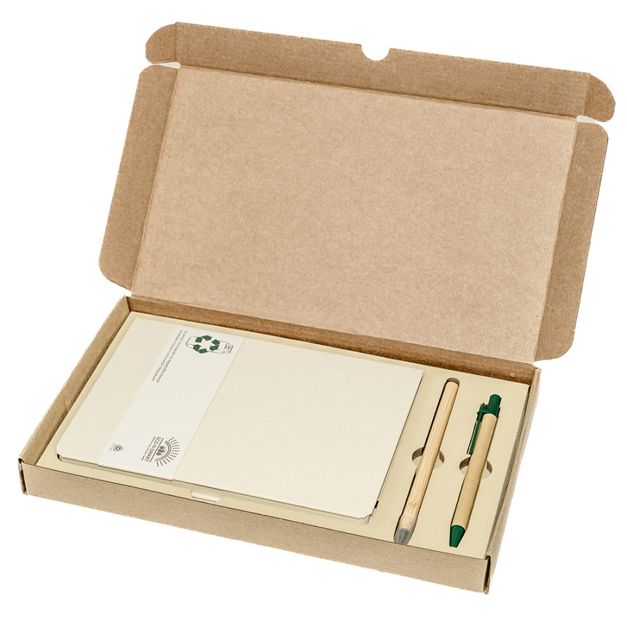 Подарочный набор в стильной картонной коробке бежевого цвета. Внутри на аккуратном ложементе располагаются ежедневник недатированный в твердом переплете и картонная ручка с колпачком.
