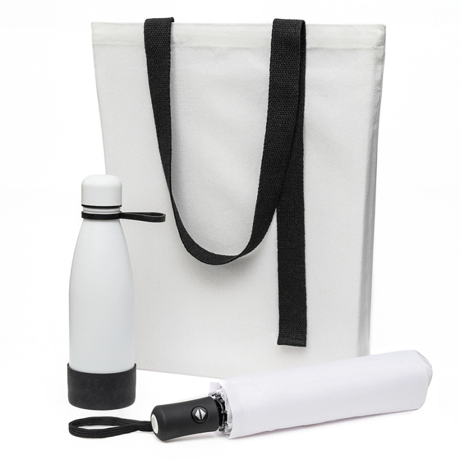 В него входят элегантный шоппер, удобная термокружка и надежный зонт, которые помогут вам быть готовым ко всему.