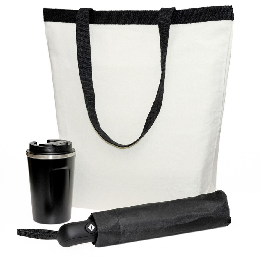 В нем собраны три незаменимых аксессуара: стильный шоппер для покупок, термокружка для горячих напитков на ходу и надежный зонт, который защитит вас от непогоды.