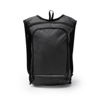 Рюкзак из 600D RPET. Основное отделение с верхней застежкой-молнией и двумя отверстиями для питьевых шлангов. Включает большой внешний передний отсек с застежкой-молнией. Обе застежки-молнии оснащены черным язычком. Имеет горизонтальную светоотражающую полосу спереди, которая улучшает видимость. Мягкие ручки и спинка.