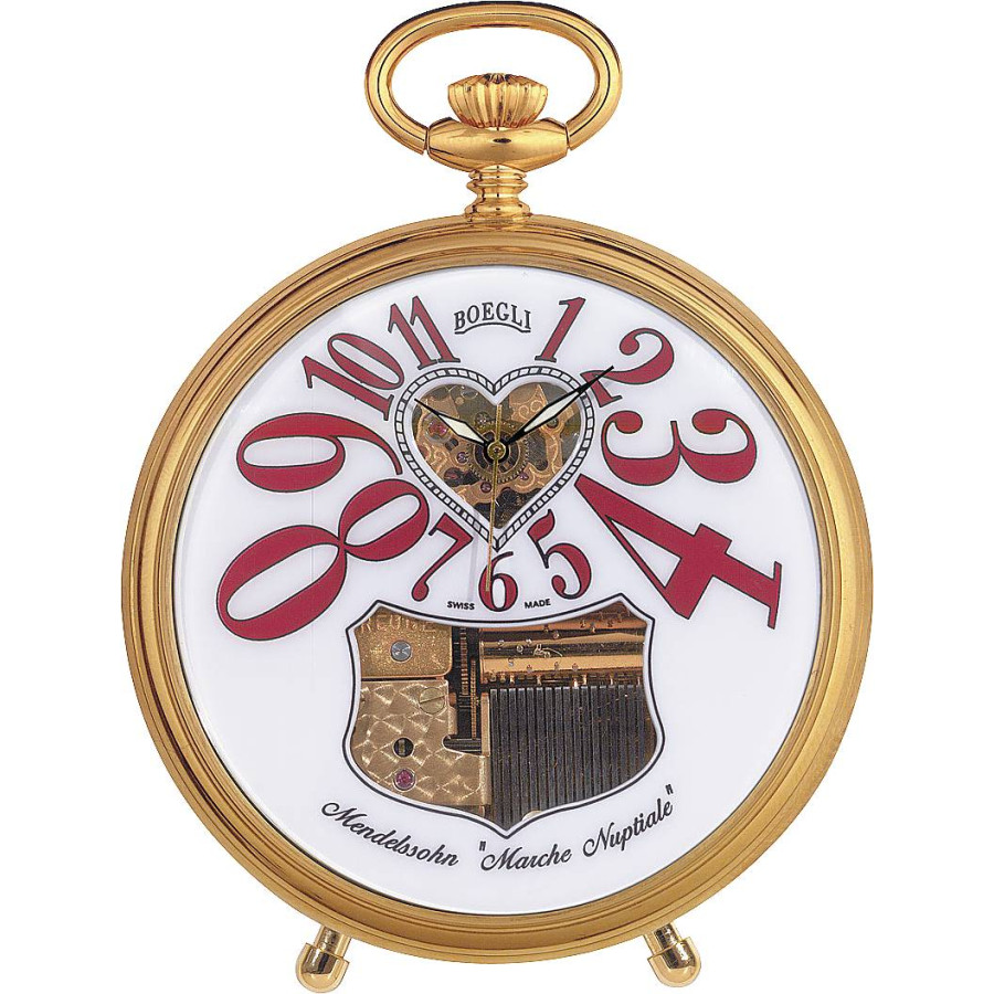 Ход карманных часов BOEGLI регулируется швейцарским механизмом с ручным заводом, оснащенным семнадцатью рубиновыми подшипниками. Скелетонизированный циферблат демонстрирует работу гребенчатого музыкального механизма, проигрывающего классическую мелодию.