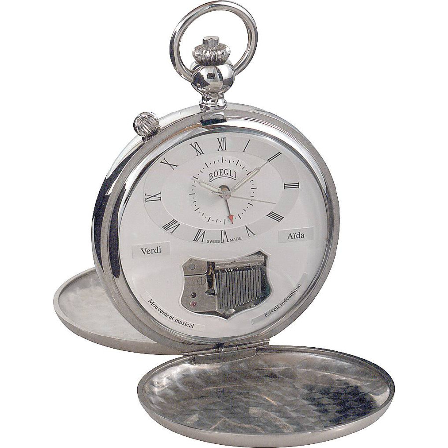 Ход карманных часов BOEGLI регулируется швейцарским механизмом с ручным заводом, оснащенным семнадцатью рубиновыми подшипниками. Скелетонизированный циферблат демонстрирует работу гребенчатого музыкального механизма, проигрывающего классическую мелодию.