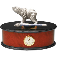 Смысловой центр композиции – фигура полярного медведя, выполненная из серебра высшей пробы, покрытая никелем. Мастера-ювелиры Prologue уделили внимание каждой детали: настоящий ценитель заметит здесь и эффект пушистого меха, и необычайно точно проработанную мускулатуру величавого животного, и поражающую естественность позы, в которой неторопливый герой застыл на декоративной подставке из ценных пород дерева.