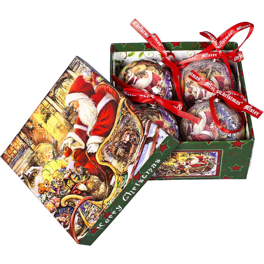 Хотите удивить своих близких и друзей стильным новогодним подарком? Наш интернет магазин представляет набор из 4 елочных шаров "папье-маше" Mister Christmas. Это сувениры ручной работы, сделанные по мотивам старинного вида декоративного искусства «papier-mache». Изумительной красоты шары очень легкие, но в то же время удивительно прочные. На создание одной такой елочной игрушки уходит несколько дней. И в результате мы видим настоящее произведение искусства! В изящный подарочный набор входят 2 украшения с лакированной поверхностью и 2 украшения с покрытием из мельчайшего бисера. На каждом шарике диаметром 7, 5 см изображен сюжет с добродушным Дедушкой Морозом. Все елочные игрушки в наборе украшены атласной красной ленточкой с логотипом бренда Mister Christmas. Набор эксклюзивных шаров продается в глянцевой шестиугольной коробочке с интересным дизайном: Дед Мороз мчится в оленьей упряжке быстрее ветра, чтобы успеть подарить подарки всем, кто их ждет. Елочные шарики «папье-маше» от Mister Christmas станут превосходным подарком к Новому Году, а так же дополнят коллекцию оригинальных новогодних елочных украшений.