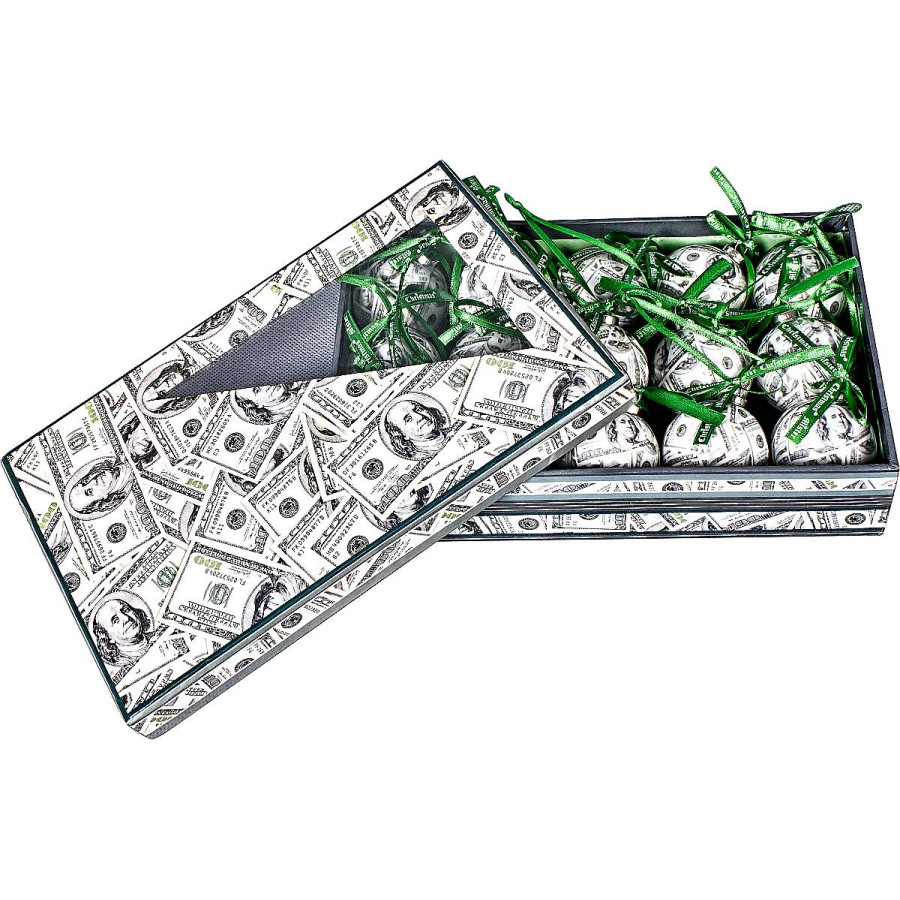 У традиционного елочного шара с каждым годом появляется все большее количество оформлений: разнообразные цвета и фактуры, персонажи и сюжеты, размеры. Во всем этом многообразии особенно ярко выделяется своим стилевым решением набор новогодних шаров «папье-маше». Изображение 100-долларовой купюры – таков рисунок на каждом шаре из набора. В том же стиле выполнена и подарочная коробка для набора шаров. Шары диаметром 48 мм выполнены в технике старинного французского ремесла «папье-маше». Папье-маше, прежде всего, гарантирует легкость изделия, что немаловажно для елочной игрушки. Также шары из набора имеют лаковое покрытие, которое придает изделию дополнительную прочность. Набор елочных шаров «папье-маше» состоит из 15 одинаковых изделий. Такого количества игрушек вполне хватит для украшения праздничной елки в офисе или дома. У каждого шара из набора есть фирменная зеленая ленточка Mister Christmas. Такой набор елочных украшений станет приятным подарком близким, коллегам или партнерам. Будьте уверены – стиль, качество и уровень вашего подарка-пожелания непременно оценят по достоинству!