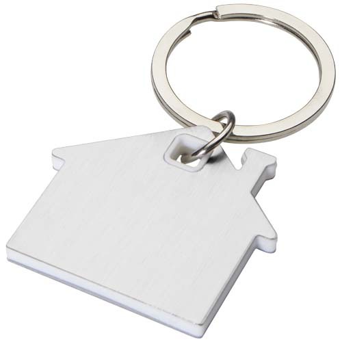 Брелок для ключей в форме домика с пластиной из нержавеющей стали с матовым узором спереди и сзади и цветной пластиковой фишкой посередине.