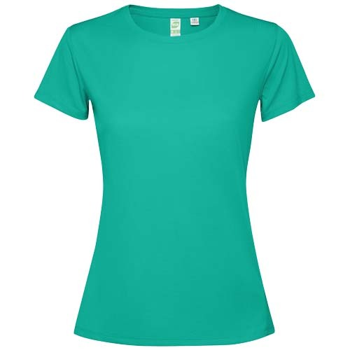 Приталенная футболка из технической ткани с короткими рукавами для женщин. Воротник со швами в цвет. Подол сзади немного длиннее переда. Боковые швы смещены вперед.