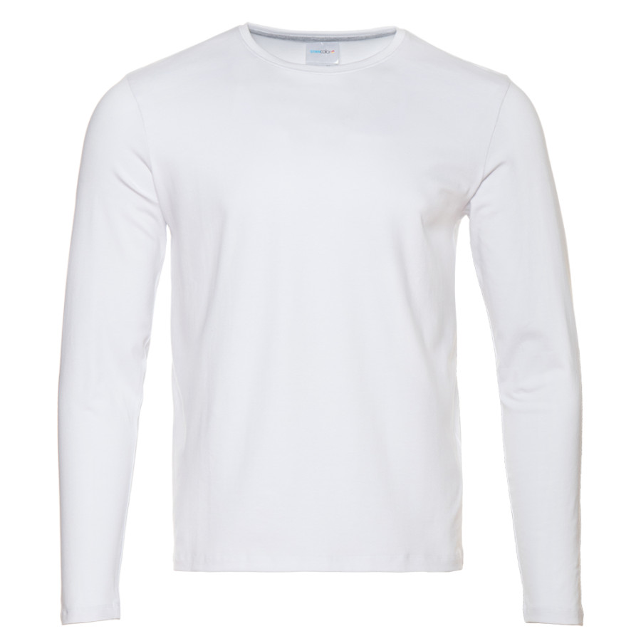 Универсальная футболка прямого силуэта с округлым воротом и длинным втачным рукавом. Плечевые швы и шов горловины усилены настрочной бейкой из основного полотна.