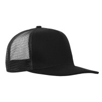 Бейсболка-пятиклинка с прямым жестким козырьком и пластиковой регулируемой застежкой, боковые клинья выполнены из жесткой сетки.