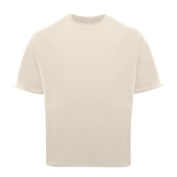 Футболка оверсайз-силуэта со спущенной линией плеча и необработанным краем рукава, горловины и по низу изделия.