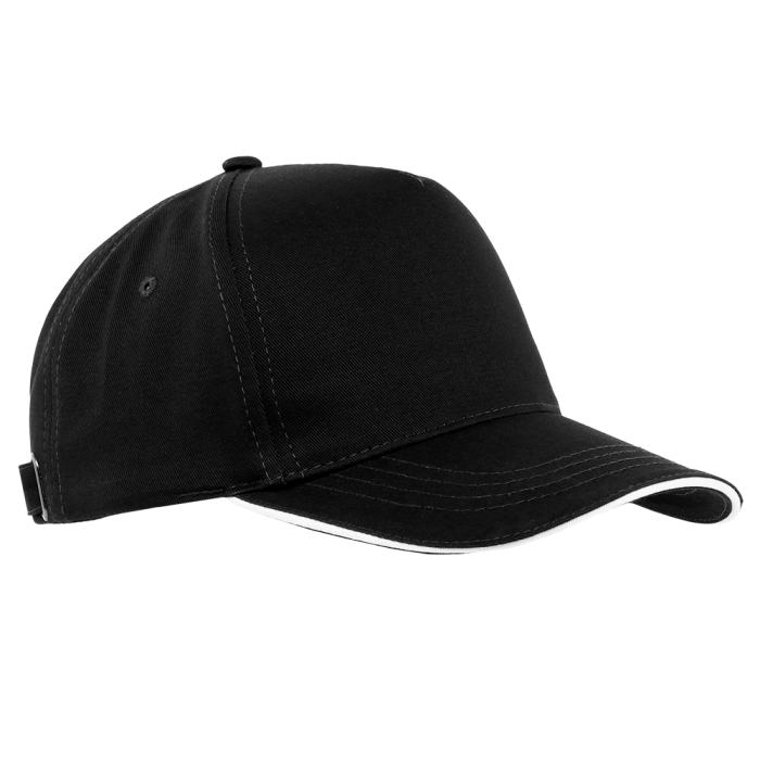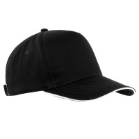 Пятиклиновый пошив, отсутствие лобового шва и изогнутый жесткий козырек «сэндвич» с контрастным кантом. Посадка регулируется ремешком с металлической застежкой.