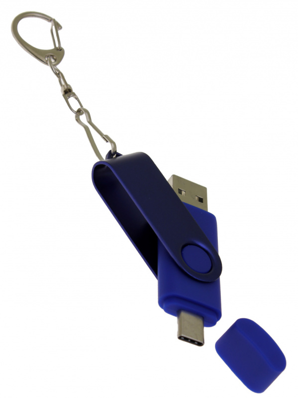 OTG_2in1_TC_031 Флеш-накопитель 2 в 1 поворотный механизм, c дополнительным разъемом Type-C с одноцветным металлическим клипом, синий.