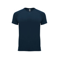 Спортивная футболка с коротким рукавом реглан. Круглый вырез горловины с отделкой плоским швом. Рукав сложного кроя для обеспечения дополнительного удобства при занятиях спортом. Отделка плоским швом с застилом по пройме и рукавам.