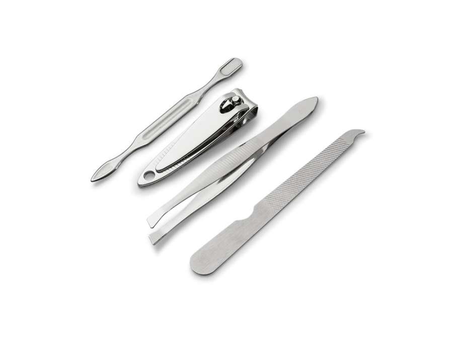 Набор из 4 предметов для маникюра в пакете из ПВХ, состоящий из пилочки, пинцета, щипчиков для ногтей и лопатки для кутикулы. 66 x 105 мм. Вид нанесения, рекомендуемый поставщиком: трафаретная печать, гравировка. Комплектность: пилочка, пинцет, щипчики для ногтей, лопатка для кутикулы