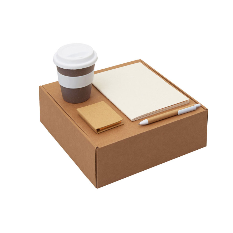 | Материал: | блокнот- бумага из переработанных тетра-паков, ручка- картон,пластик, стакан- 50% бамбуковое волокно, 50% полипропилен, коробка- картон |