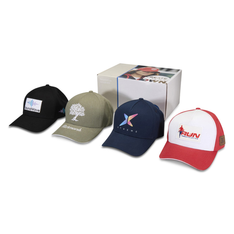 Коробка с образцами 4 бейсболок разных стилей: 1 Boston бейсболка из переработанного хлопка с 5 панелями, 1 Houston бейсболка из переработанного хлопка с 6 панелями, 1 Arizona бейсболка из переработанного хлопка с 5 панелями и многослойным козырьком и 1 Richmond Aware™ бейсболка из переработанного хлопка с 6 панелями и многослойным козырьком. Картон.
