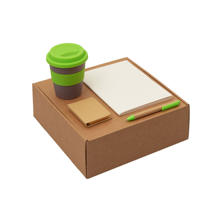 | Материал: | блокнот- бумага из переработанных тетра-паков, ручка- картон,пластик, стакан- 50% бамбуковое волокно, 50% полипропилен, коробка- картон |