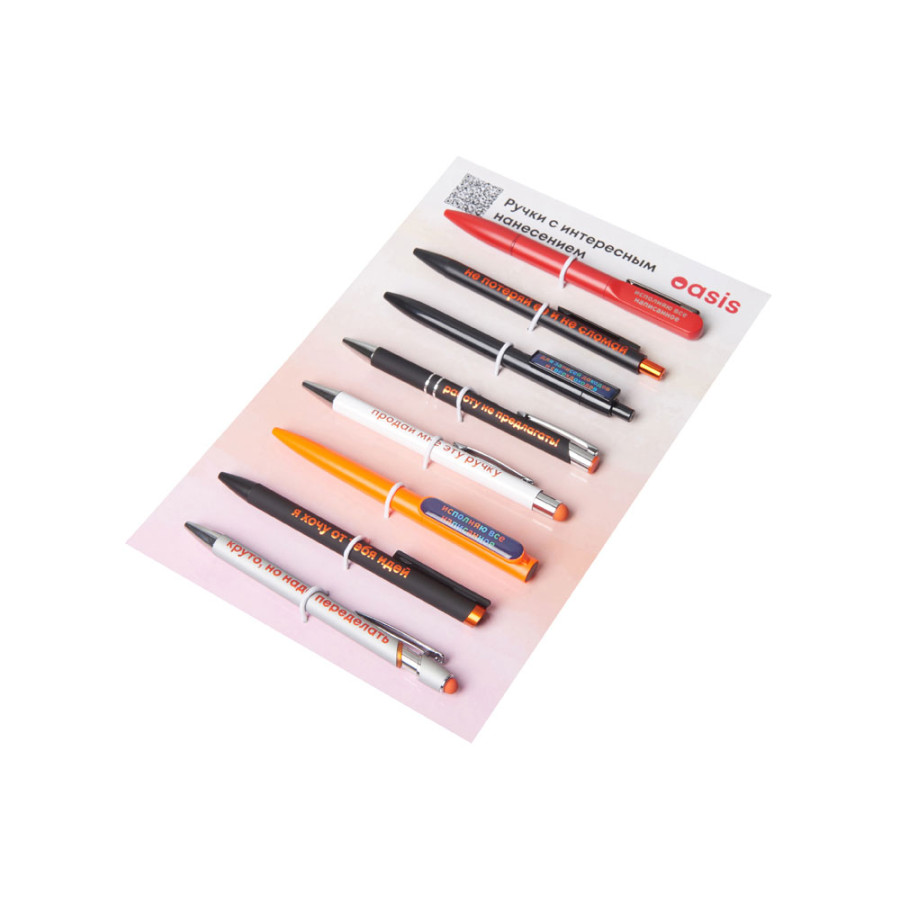 Промо-сет ручек с интересными нанесениями — это презентационный комплект, включающий 8 уникальных моделей с несколькими вариантами нанесения: гравировка и заливка полимерной смолой.