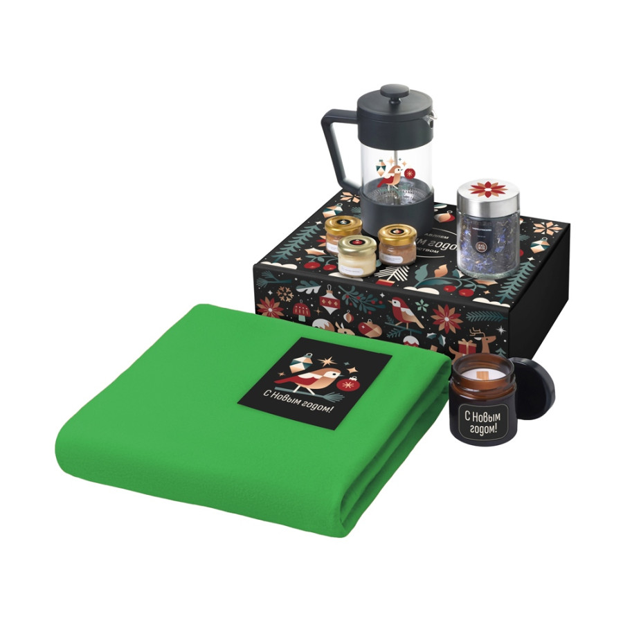 Подарочный набор c пледом, френчпрессом, чаем и медом, зеленый