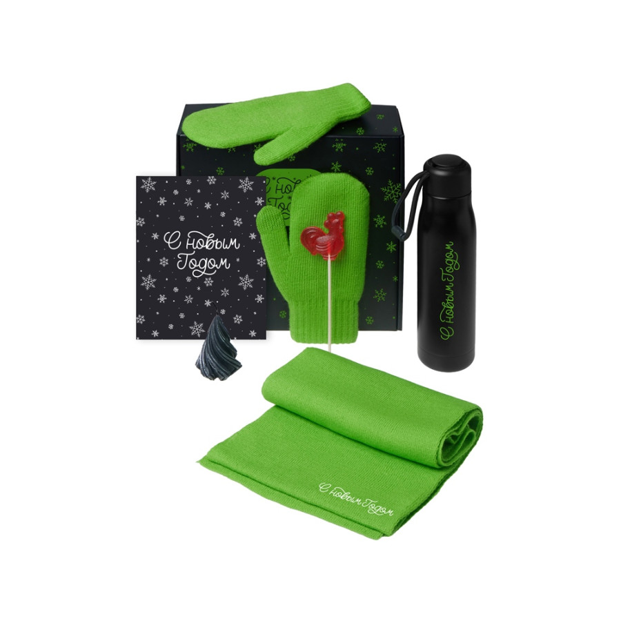 Подарочный набор с варежками, шарфом и термосом, зеленое яблоко