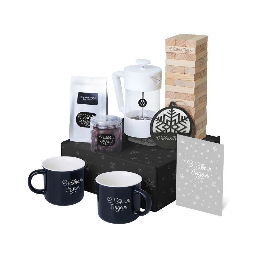 | Материал: | кружка - костяной фарфор; френч-пресс - боросиликатное стекло, нержавеющая сталь, пластик; игра - дерево сосны, хлопок; подвеска - дерево; открытка - бумага; мешок - нетканый материал (спанбонд) |