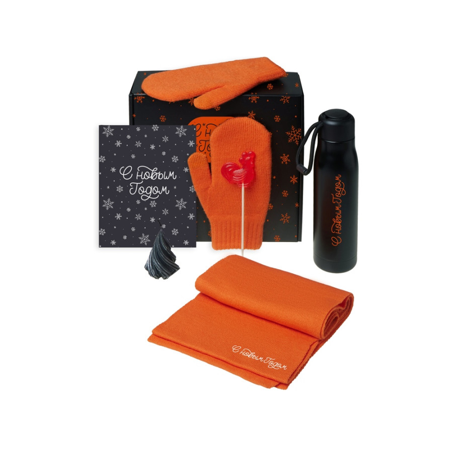 Подарочный набор с варежками, шарфом и термосом, оранжевый