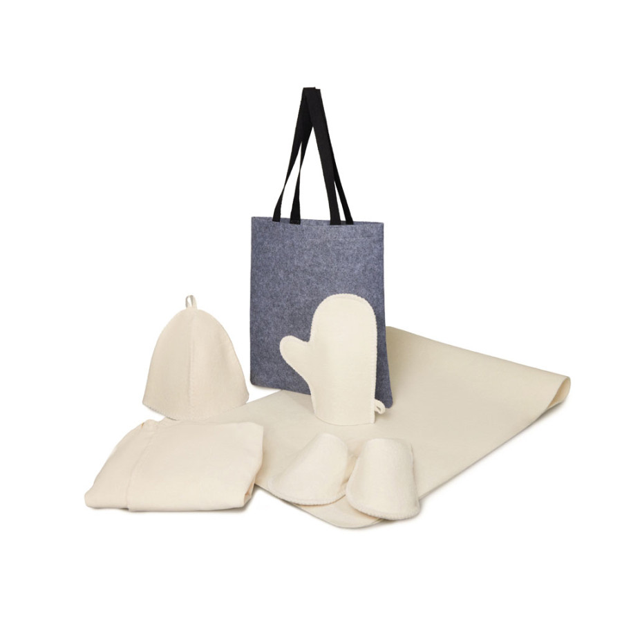 Банный набор Healing для настоящего ценителя сауны: коврик-лежак, мужской вафельный килт, рукавица, шапка, тапочки — всё в стильном фетровом шоппере.