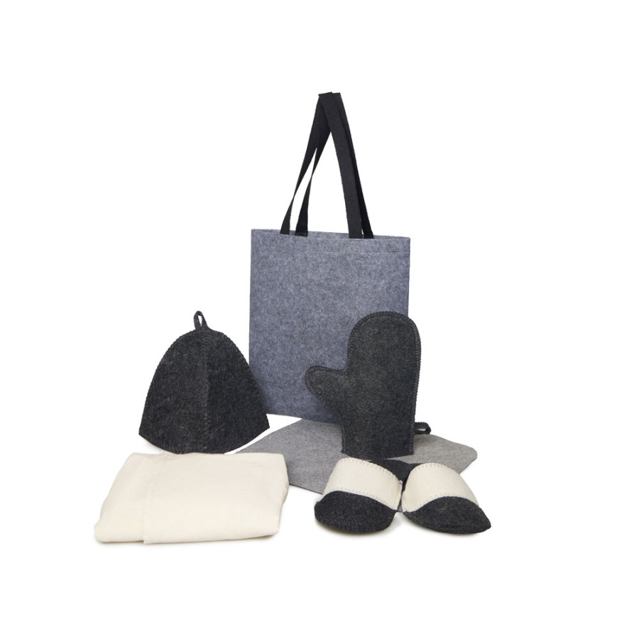 Банный набор Healing для настоящего ценителя сауны: коврик, мужской холщовый килт, рукавица, шапка, двуцветные тапочки — всё в стильном фетровом шоппере.