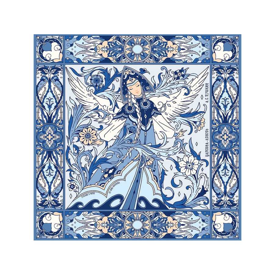 В центре авторского принта — удивительной красоты женщина с белоснежными крыльями, наделенная магическими способностями и житейской мудростью. Оригинальное сочетание тонов, цветочных орнаментов и русского колорита делают аксессуар нежным и самобытным.