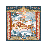 Художественное пространство выстроено подобно книжной иллюстрации, где центральный сюжет раскрывается в обрамлении узоров по мотивам деревянного зодчества. Тройка лошадей, сани с красной девицей, стилизованный облик Деда Мороза или Морозко, ели, припорошенные снегом, в окружении добрых лесных зверей, – наполнены глубоким символизмом и создают атмосферу волшебства. Православные церкви среди пышных сугробов, озаренные яркими солнечными лучами, знаменуют торжество веры, возрождения и любви.