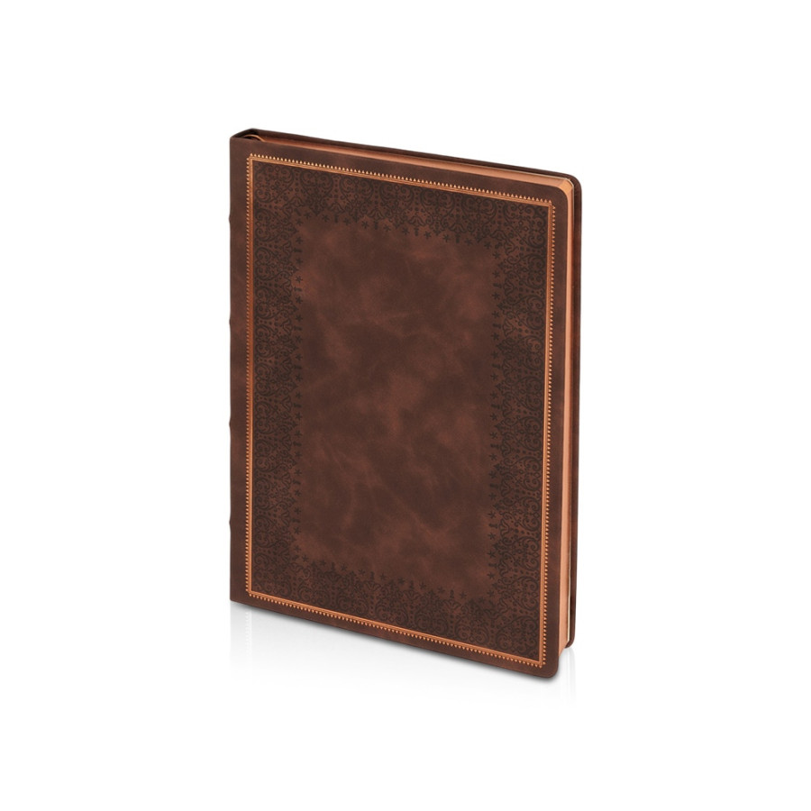 Недатированный ежедневник Royal формата А4 с твердой обложкой из искусственной кожи с имитацией нубука украшен художественным бронзовым и блинтовым тиснением. Внутри 192 страницы, выполненные из качественной бежевой бумаги в линейку плотностью 140 г/м². Два шелковых ляссе в цвет обреза блока и обложки облегчают навигацию по записям. Французский корешок дополнительно декорирован изящным бронзовым тиснением в виде виньеток. Скругленные углы обложки и блока подчеркивают стильный дизайн изделия, а блеск бронзового обреза дарит ежедневнику благородный и роскошный внешний вид.