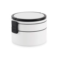Двухъярусный круглый ланчбокс из полипропилена с боковой застежкой-клипсой и ручками. Есть внутренние крышки белого цвета. Объем: верхняя часть 250 мл, нижняя часть 700 мл.